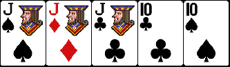 На русском Фул Хаус. Переводится с английского как «полный дом», такое название дано не просто так. Комбинация состоит из двух других сочетаний: Тройки и Пары. То есть три карты с одинаковым рангом +еще 2 карты с идентичным номиналом. Например, 4 бубен, 4 червей, 4 пики, 7 треф, 7 пики. Старшинство сочетания принято определят по достоинству трех карт.