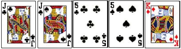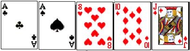 Две одинаковые карты по номиналу в одной руке, самая часто выпадающая комбинация. Масть не играет никакой роли. Пример: два туза, две девятки, две десятки и так далее.