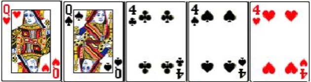 С английского переводится «полный дом». Комбинация означает, что игроку удалось собрать три пары карт одного номинала (Тройка) и плюс еще две пары. Пример: три пятерки и два вальта.