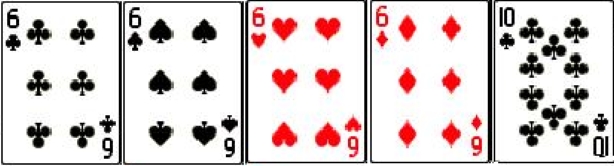 Комбинация составляется из четырех карт одинаковых по рангу. За покерным столом выпадает редко. Пример: четыре туза, четыре тройки, четыре дамы.