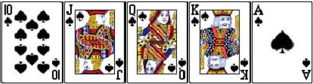 Комбинация составляется из пяти карт, идущих по порядку. Пример: 6,7,8,9,10 любых мастей. Особенность сочетания в том, что туз может выступать и как самая старшая карта, и как самая низкая в руке, то есть в качестве единицы (туз, 2,3,4,5).