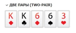 Далее идет Две пары. Комбинация состоит из двух пар карт с одинаковым рангом (две десятки и два короля, например). Пятая карта является побочной.