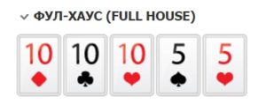 Заканчивается средняя группа комбинацией Фулл Хаус. Из названия понятно, что это переводится как «полный дом». Сочетание состоит из трех карт одинакового достоинства и плюс двух с одинаковым рангом (три туза и две дамы, например).