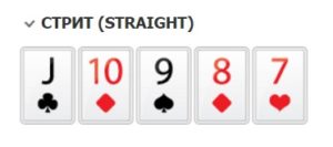 Открывает среднюю группу Стрит – комбинация из пяти карт, следующих в номинальном порядке друг за другом (8 червей, 9 бубен, 10 пики, валет треф, дама черви, например). Особое значение имеет туз, который может выступать как единица в сочетании туз, 2,3,4,5.