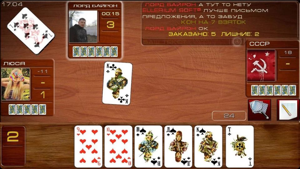 - Далее первый участник слева от дилера кладет первый элемент на стол. Остальные должны положить аналогичную масть, либо козырь. А если нет ни того другого, то любую карту с самым младшим номиналом.