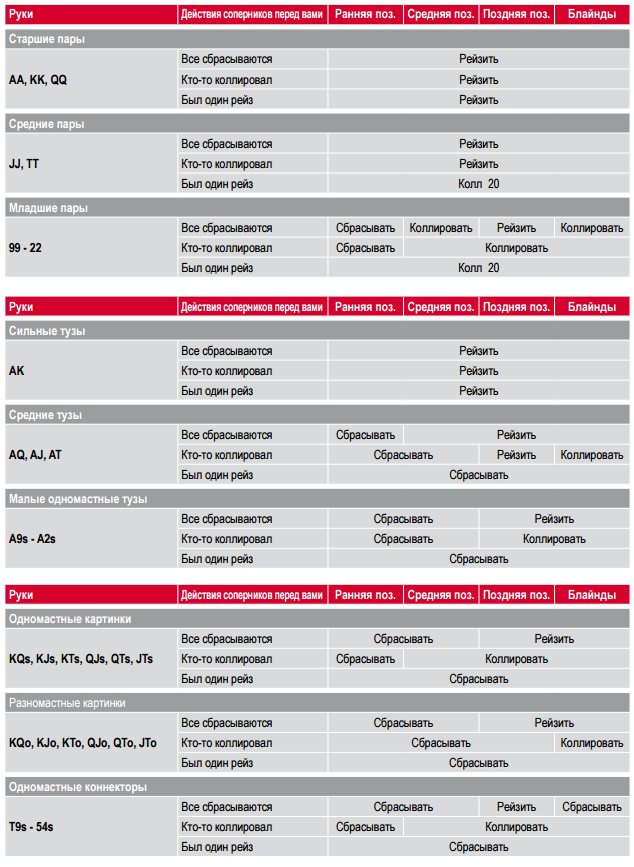 Каждый начинающий игрок обязательно должен пользоваться таблицей стартовых рук в Холдеме, она поможет не потерять весь банк из-за неопытности и оценить первоначальные шансы на успешное завершение раунда. По мере накопления опыта, покерист начинает играть более гибко и смотрит не только на карманные карты, но и на поведение соперников и на ситуацию за столом в целом.